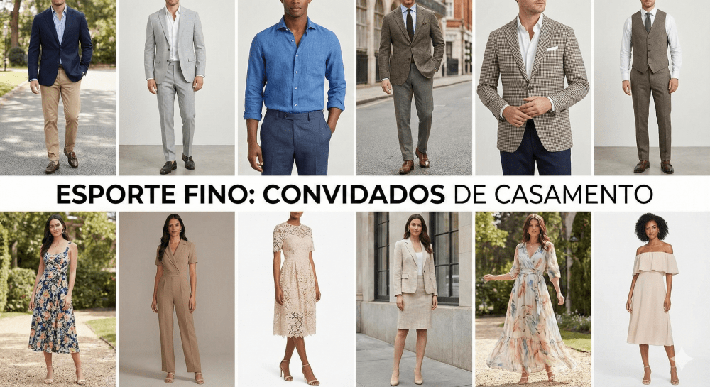 Homens: Calça de alfaiataria ou sarja (chino), camisa social, blazer opcional (não precisa combinar com a calça), sapatos sociais ou mocassins. Gravata é opcional.